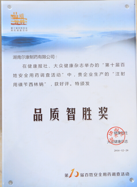 湖南爾康制藥榮獲“品質(zhì)智勝獎(jiǎng)” 爾康湘藥生產(chǎn)的“磺芐西林鈉”獲得百姓認(rèn)可 12月20日,由國(guó)家衛(wèi)生計(jì)生委藥政司指導(dǎo),健康報(bào)社和大眾健康雜志主辦的第10屆百姓安全用藥調(diào)查活動(dòng)總結(jié)大會(huì)在廣東省深圳市舉行。會(huì)上,湖南爾康湘藥制藥生產(chǎn)的“注射用磺芐西林鈉”,與廣州白云山制藥總廠、深圳華潤(rùn)九新藥業(yè)等在內(nèi)的30余個(gè)企業(yè)產(chǎn)品得到百姓認(rèn)可,榮獲“品質(zhì)智勝獎(jiǎng)”。 據(jù)了解,此次評(píng)審評(píng)以健康報(bào)及門戶網(wǎng)站刊登調(diào)查問卷投票依據(jù),由臨床專業(yè)人員、公眾投票產(chǎn)生,候選企業(yè)最后經(jīng)組委會(huì)篩選、質(zhì)量評(píng)估確定。因活動(dòng)內(nèi)容貼近群眾,接受調(diào)查的企業(yè)產(chǎn)品過硬,活動(dòng)推出的“放心藥獎(jiǎng)”評(píng)選一直堅(jiān)持公正、公開的原則,評(píng)選過程嚴(yán)謹(jǐn),透明,并且定期公示調(diào)查結(jié)果,從而獲得了社會(huì)公眾、醫(yī)藥行業(yè)的好評(píng)。 湖南爾康湘藥制藥生產(chǎn)的“注射用磺芐西林鈉”之所以能獲得百姓認(rèn)可,這與爾康制藥多年來注重研發(fā)、注重生產(chǎn)工藝創(chuàng)新,秉持“專業(yè)成就未來、品質(zhì)鑄就輝煌”的經(jīng)營(yíng)理念密不可分。在同類產(chǎn)品中,湘藥生產(chǎn)“注射用磺芐西林鈉”采用的是瓶?jī)鰞龈缮a(chǎn)工藝,其工藝水平和產(chǎn)品質(zhì)量堪比日本武田公司;另外,湘藥的青霉素類凍干粉針劑車間在2013年率先通過新版GMP認(rèn)證,在品質(zhì)保證方面更上臺(tái)階、領(lǐng)先于同類產(chǎn)品,亦得到醫(yī)生和患者的認(rèn)可。 對(duì)于患者來說,在抗生素泛濫使用的醫(yī)療環(huán)境下,注射用磺芐西林鈉作為低代次的青霉素類藥品,比頭孢菌素類(3代、4代)、碳青霉素類等抗菌藥品的安全性更好,不易產(chǎn)生耐藥性。