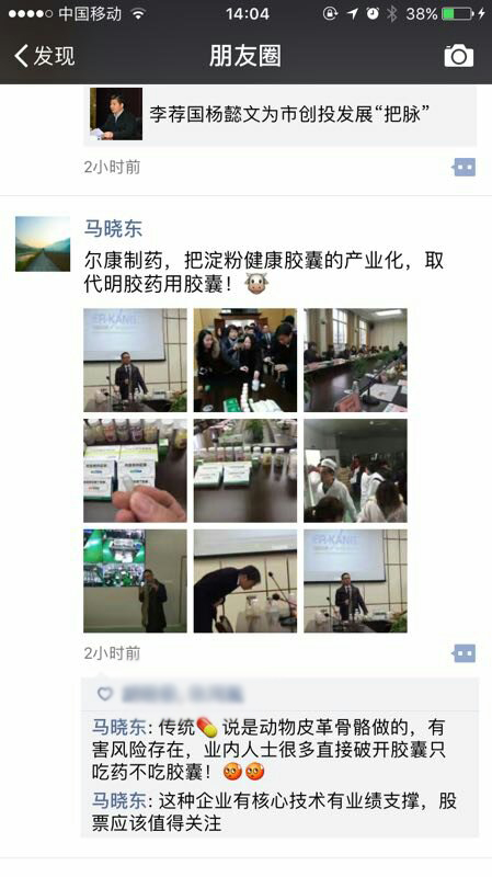 網絡大V在朋友圈為爾康制藥淀粉膠囊點贊