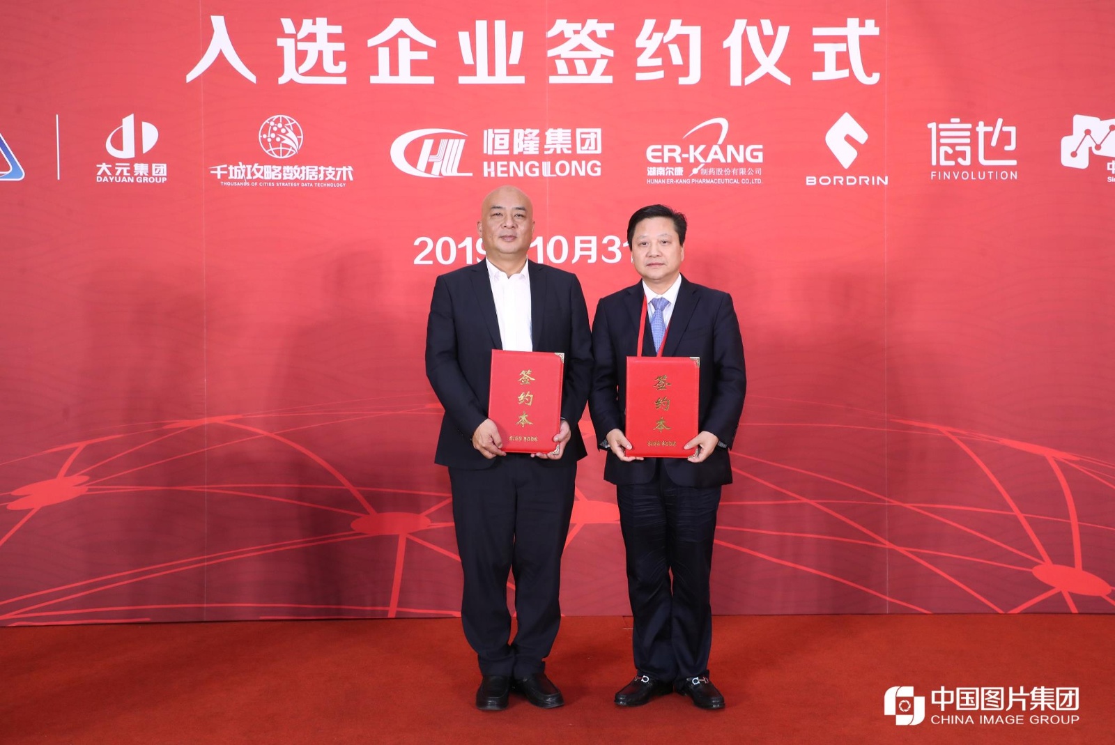 新華社總經(jīng)理室副總經(jīng)理兼新聞信息中心副主任潘海平(左)與爾康制藥董事長帥放文(右)交換協(xié)議文本