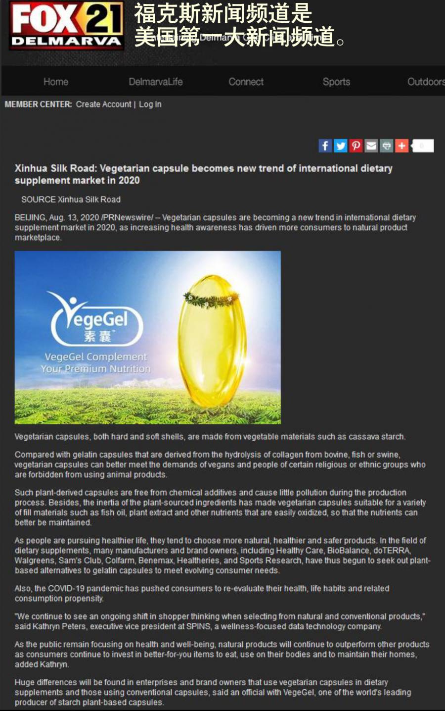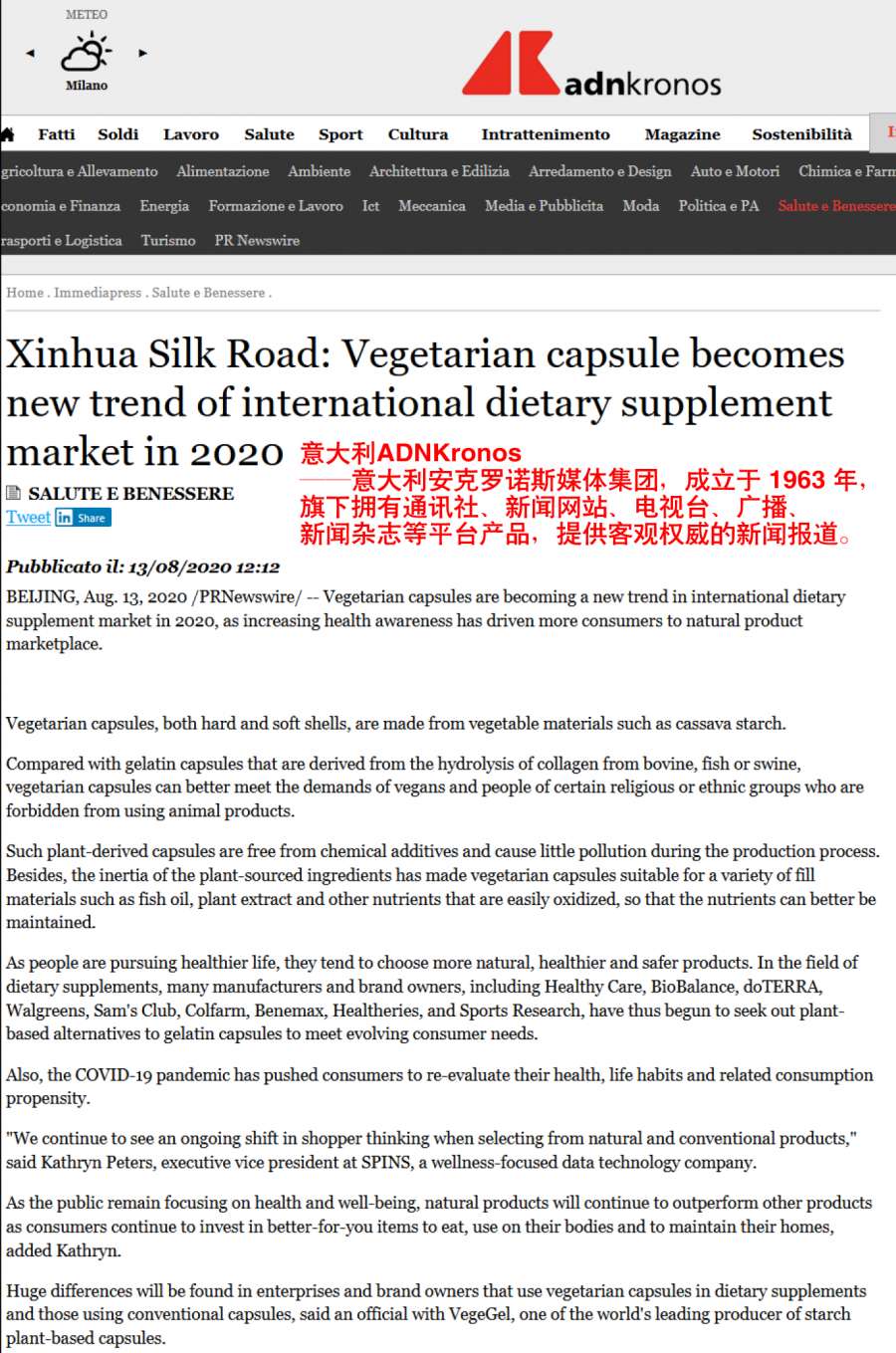 日前,植物膠囊在國際上再度引起關(guān)注,一篇題為《Vegetarian capsule becomes new trend of international dietary supplement market in 2020》探討淀粉植物膠囊或成2020年膳食補(bǔ)充劑新趨勢的文章,被北美Fox、Yahoo! Finance、Business Insider: Markets Insider 、Seeking Alpha、Canadian Business Journal,歐洲Xpert、Notre Siècle、FinanzNachrichten.de、ADNKronos 、Europa Press 、PAP等超40余國家、全球近900家國際媒體轉(zhuǎn)載發(fā)布。